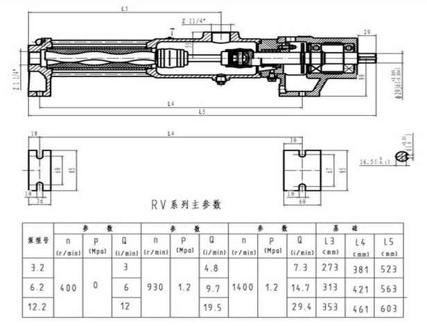 5. RV系列产品型号中的0.4、0.8、1.5则表示为0MPa,400r/min情况下,它的流量则为每分钟 0.4升 0.8升 1.5升,后一个数3则表示为三级泵,可产生1.6-1.8MPa工作压力。